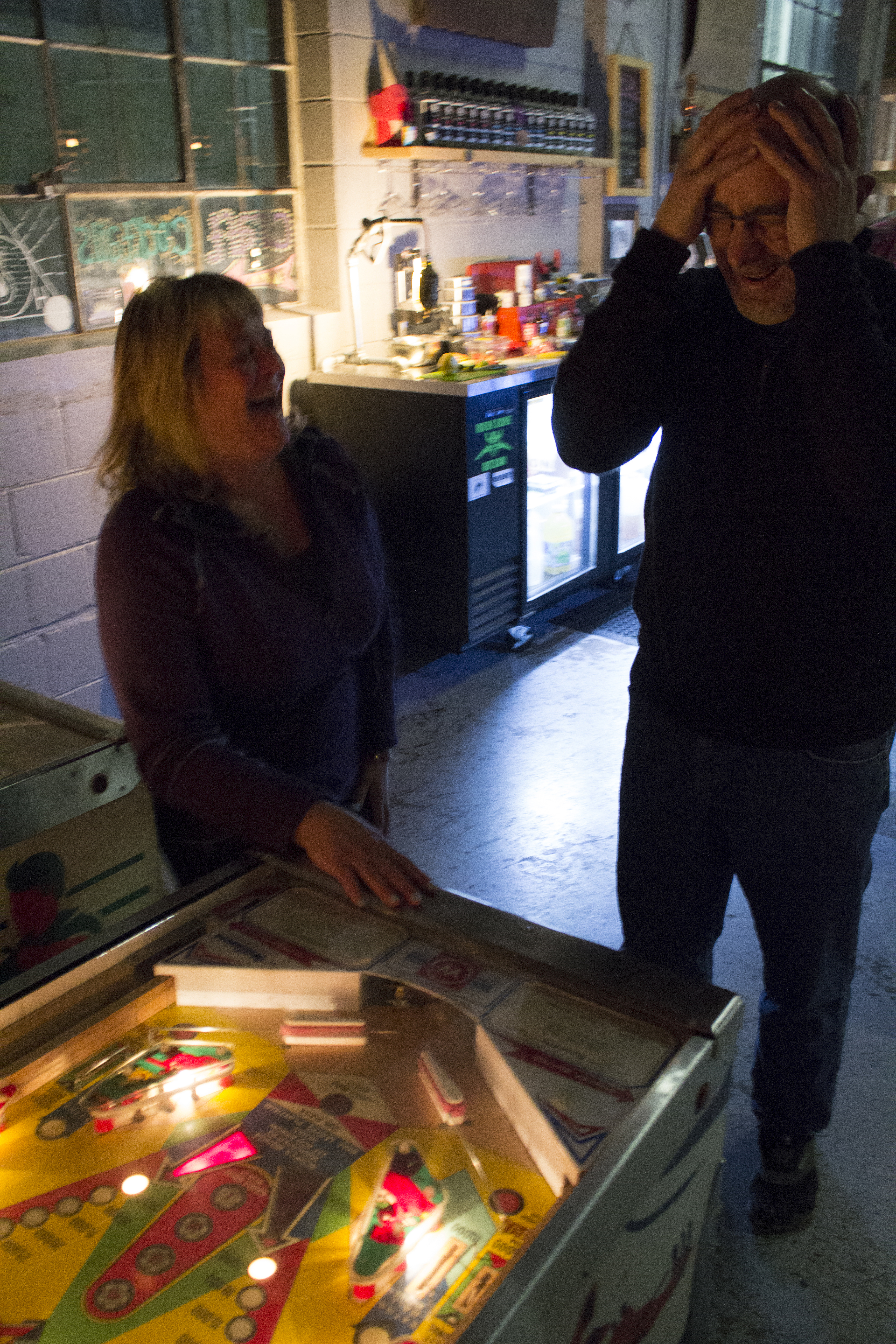 Englewood, Colo. – April 22, 2017 – Joan Heller laughs triumphantly as boyfriend Mike Friednash sinks the silver ball during a friendly date night game of retro pinball at Devil’s Head Distillery. Friednash takes the loss in stride, knowing a re-match is guaranteed, right up til last call at the local artisan watering hole. (Derek…